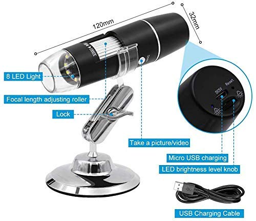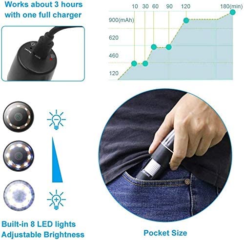 - WIRELESS MICROSCOPE with 8 LED LIGHTS: The wifi microscope uses 8 built-in LEDs to ensure it also works well at night. And can be adjusted for brightness and focal length in different detection environments. USB rechargeable design, about 3 hours of effective use time, and portable mini size, easy to carry this 1000x microscope in your pocket.
